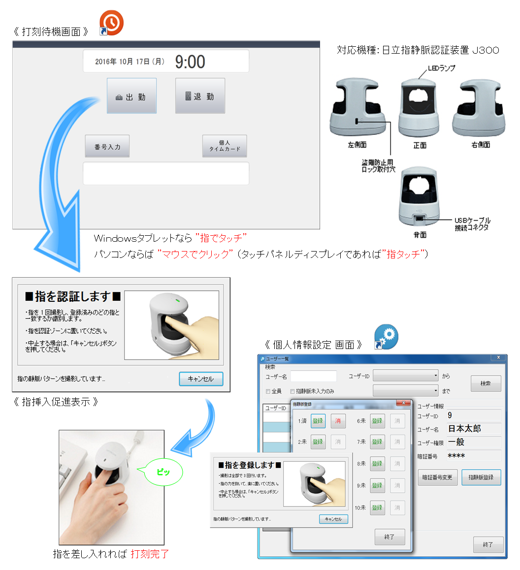 タイムレコーダー(指静脈・ICカード)を複数セット使用した運用が可能ですので、事業所が複数ある場合でも対応できます。また、タイムレコーダーを使用しない手入力での運用も可能です。