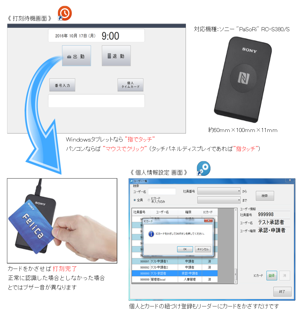 タイムレコーダー(指静脈・ICカード)を複数セット使用した運用が可能ですので、事業所が複数ある場合でも対応できます。また、タイムレコーダーを使用しない手入力での運用ももちろん可能です。