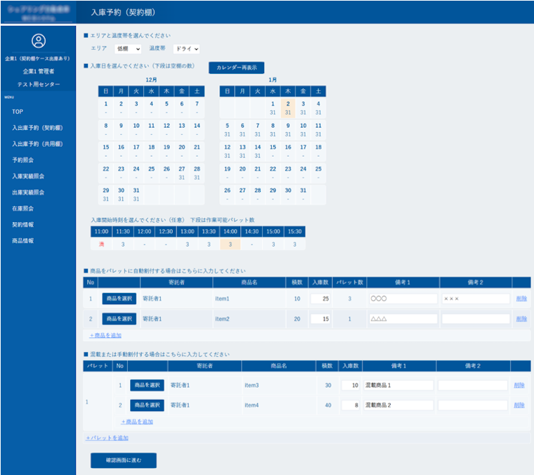 - 利用者は、ホテルの宿泊予約のように、空棚カレンダーから入庫と出庫を予約できるようにします。