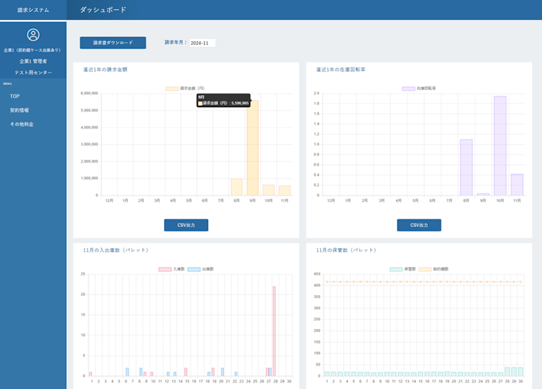 - 月毎の入出庫や在庫の実績を元に請求書を自動で作成・メール送付し、年月ごとの入出庫実績・請求金額をグラフ表示します。